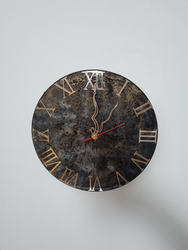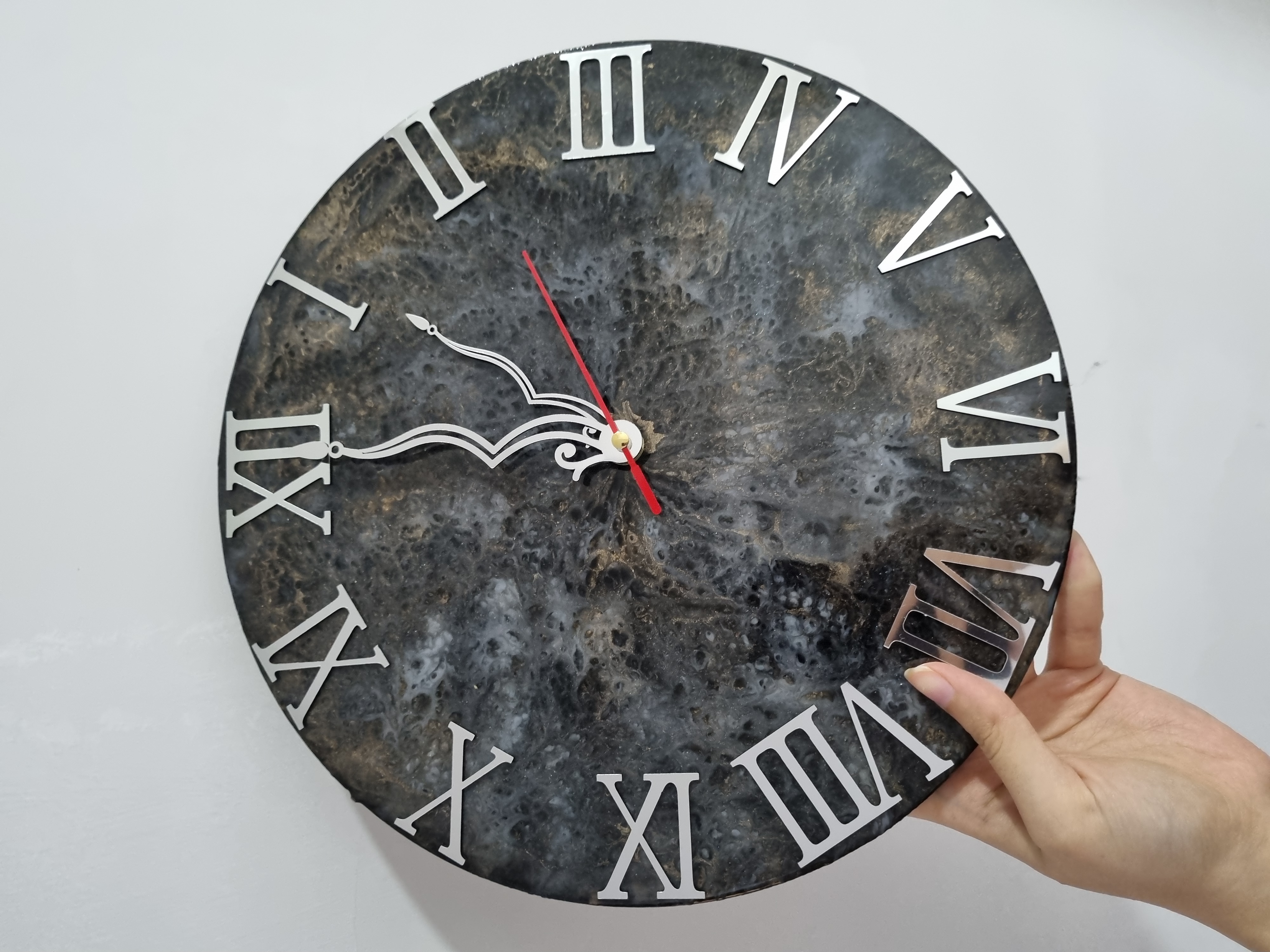 ساعت دیواری لوکس رزینی ،بیس کار چوبی باطراحی رزین، طرح سنگ،موتور آرام گرد،شفافیت در حد شیشه و نشکن، سبک و براق، قابلیت تمیز کردن با دستمال نمدار