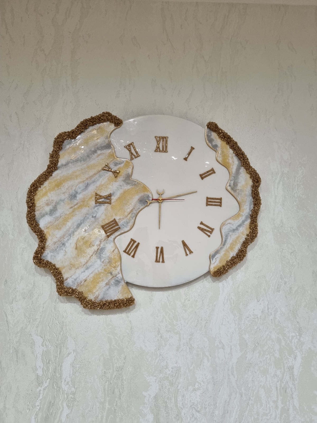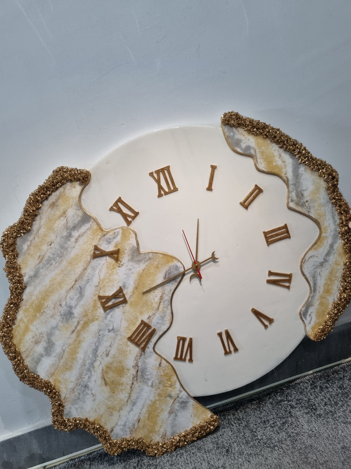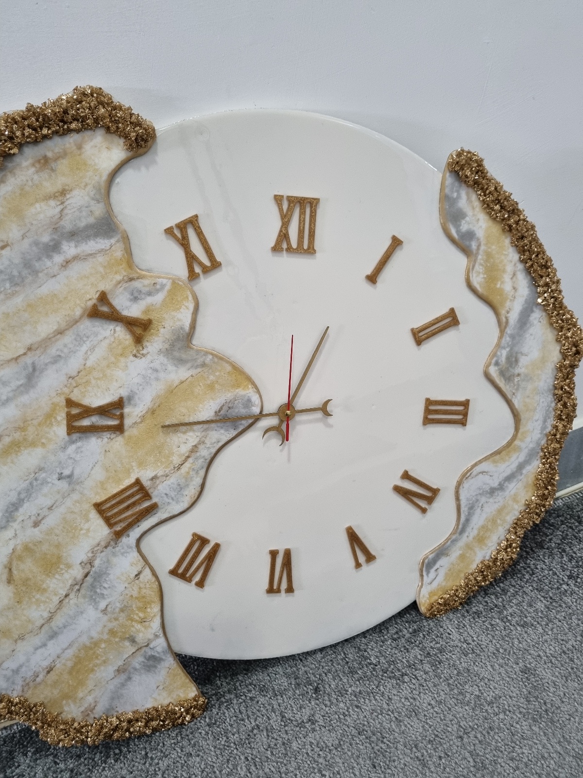 ساعت دیواری لوکس رزینی،بیس کار چوبی با طراحی رزین،طرح دفرمه دورنگ کرم و طوسی دو کریستال طلایی، اعدادرزینی، موتور آرامگرد، شفافیت در حد شیشه و نشکن،سبک و براق، قابلیت تمیز کردن با دستمال نمدار