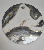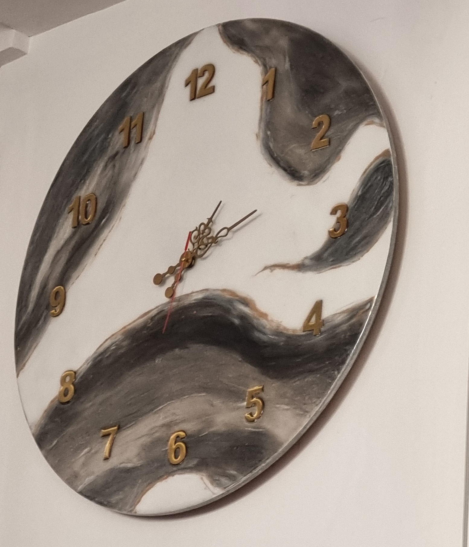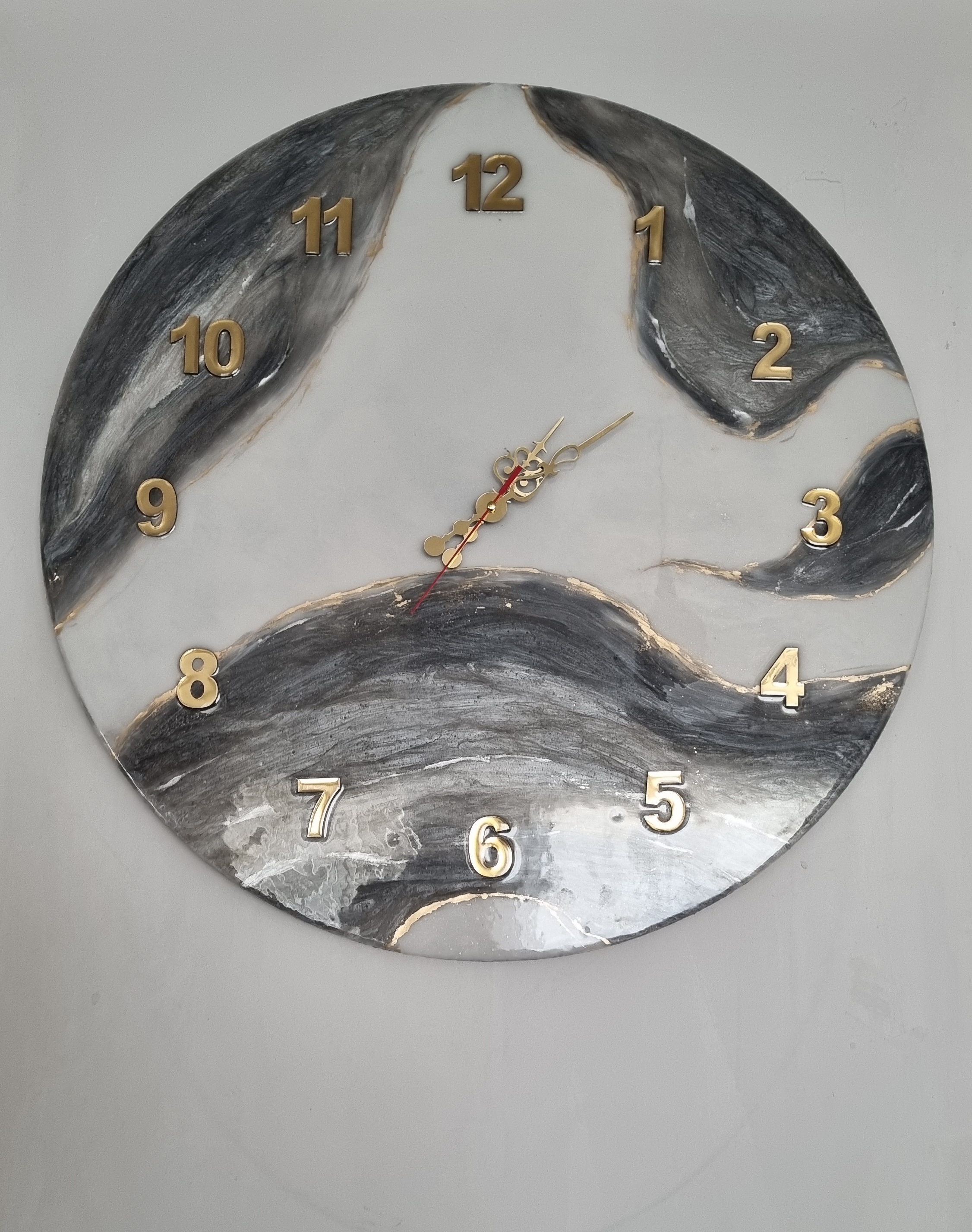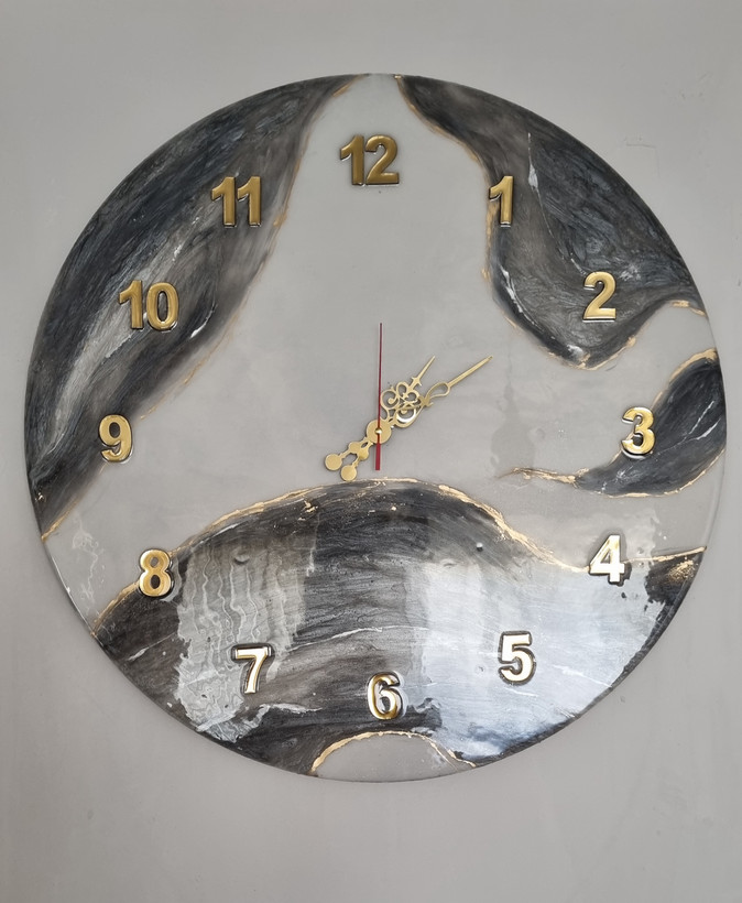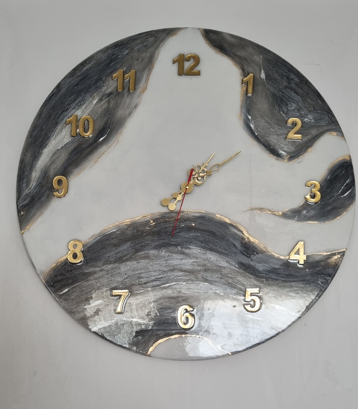 ساعت دیواری لوکس رزینی،بیس کار چوبی با طراحی رزین،طرح روسی، رنگ سفیو و طوسی با رگه های نقره ای، موتور آرامگرد، شفافیت در حد شیشه و نشکن،سبک و براق، قابلیت تمیز کردن با دستمال نمدار