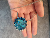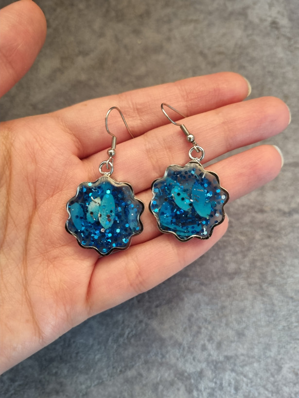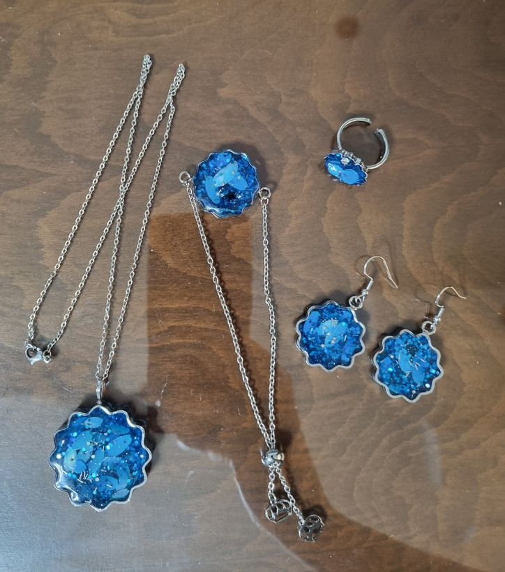 ست کامل جواهرات رزینی(گردنبند،دستبند،گوشواره و انگشتر)، رزین به همراه اکلیل و گل آبی،شفاف، دستبند ریلی، استیل جنس خوب و رنگ ثابت