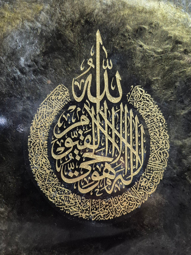 تابلوآیت الکرسی رزینی،قطر۳۰سانت،رنگ مشکی طلایی، طرح ابر و بادی، بیس چوبی با طرح رزین، شفاف و نشکن، قابلیت تمیزکردن با دستمال نمدار